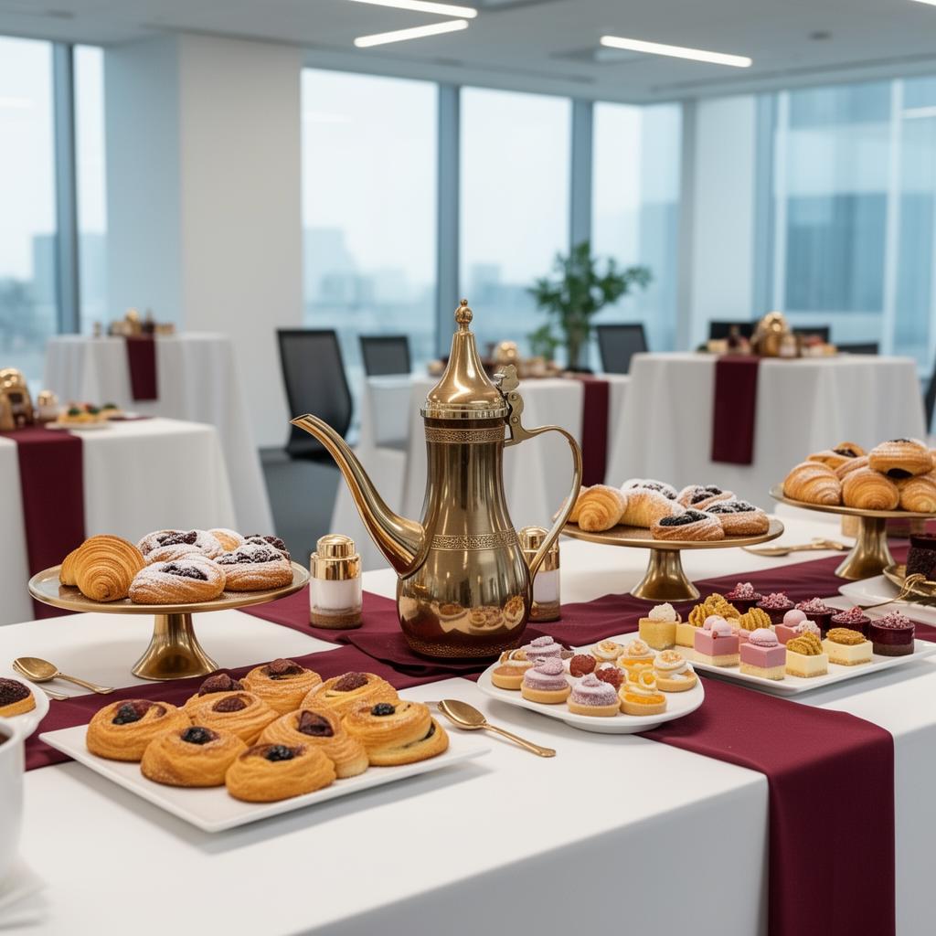Elegant refreshment stations with Arabic coffee, pastries, and gourmet treats.